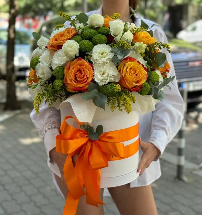 Стилна кутия, изпълнена с ярки оранжеви рози, нежни бели еустоми и свежи зелени акценти, които придават хармония. Топлите цветове създават слънчево настроение и носят усмивки, а красивата панделка в оранж завършва композицията с изящество.