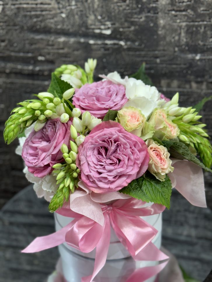 Тази елегантна кутия е създадена като истинска хармония от цветове и форми. В центъра ѝ блестят пищни розови градински рози, чиито кадифени венчелистчета излъчват романтика и изтънченост. Около тях се разгръщат нежни мини рози в прасковено и кремаво, докато свежата зеленина и деликатните бели цветове добавят лекота и усещане за чистота.